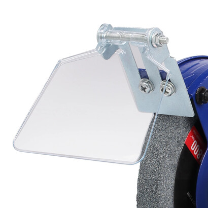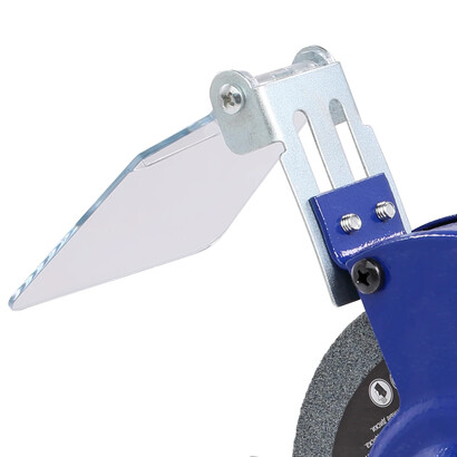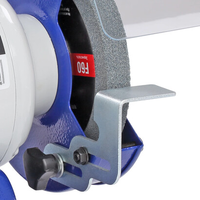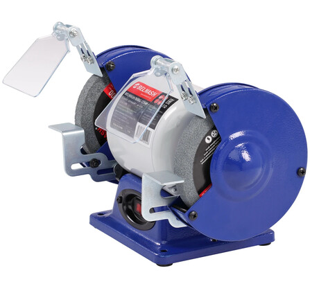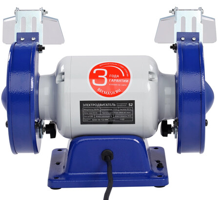 Это компактная и легкая модель. Она имеет классическую компоновку. По центру расположен асинхронный двигатель, довольно мощный - 250 Вт. По обе стороны от двигателя установлены заточные диски диаметром 125 мм и шириной 16 мм с различной зернистостью. Диски изготовлены из нормального электрокорунда (15А). Именно такой абразив используют для снятия заусенцев, фасок, обдирки на небольших заготовках, восстановления эксплуатационных свойств ручного инструмента, такого как ножи, топоры, секаторы и т. п. Оба диска оснащены стальными рабочими упорами (подручниками), защитными кожухами (листовая сталь), искрозащитными экранами из поликарбоната.