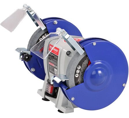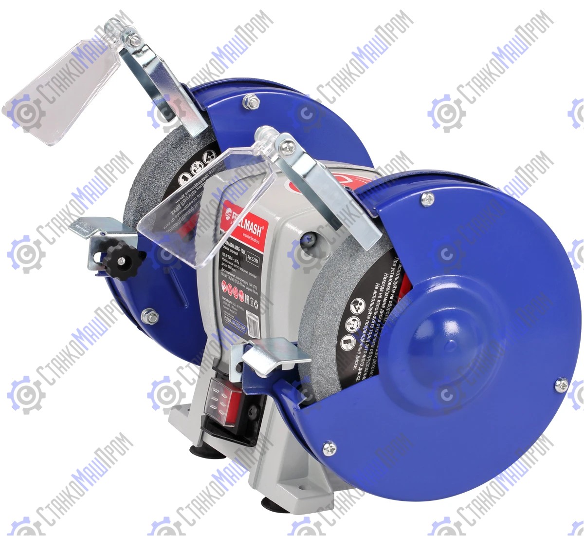 Оба диска оснащены стальными рабочими упорами (подручниками), защитными кожухами (листовая сталь), искрозащитными экранами (поликарбонат).Корпус комбинированный, его средняя часть из листовой стали, боковые части из алюминия. На переднюю часть станины выведен выключатель в пылезащитном исполнении. Имеются четыре отверстия для крепления к верстаку.