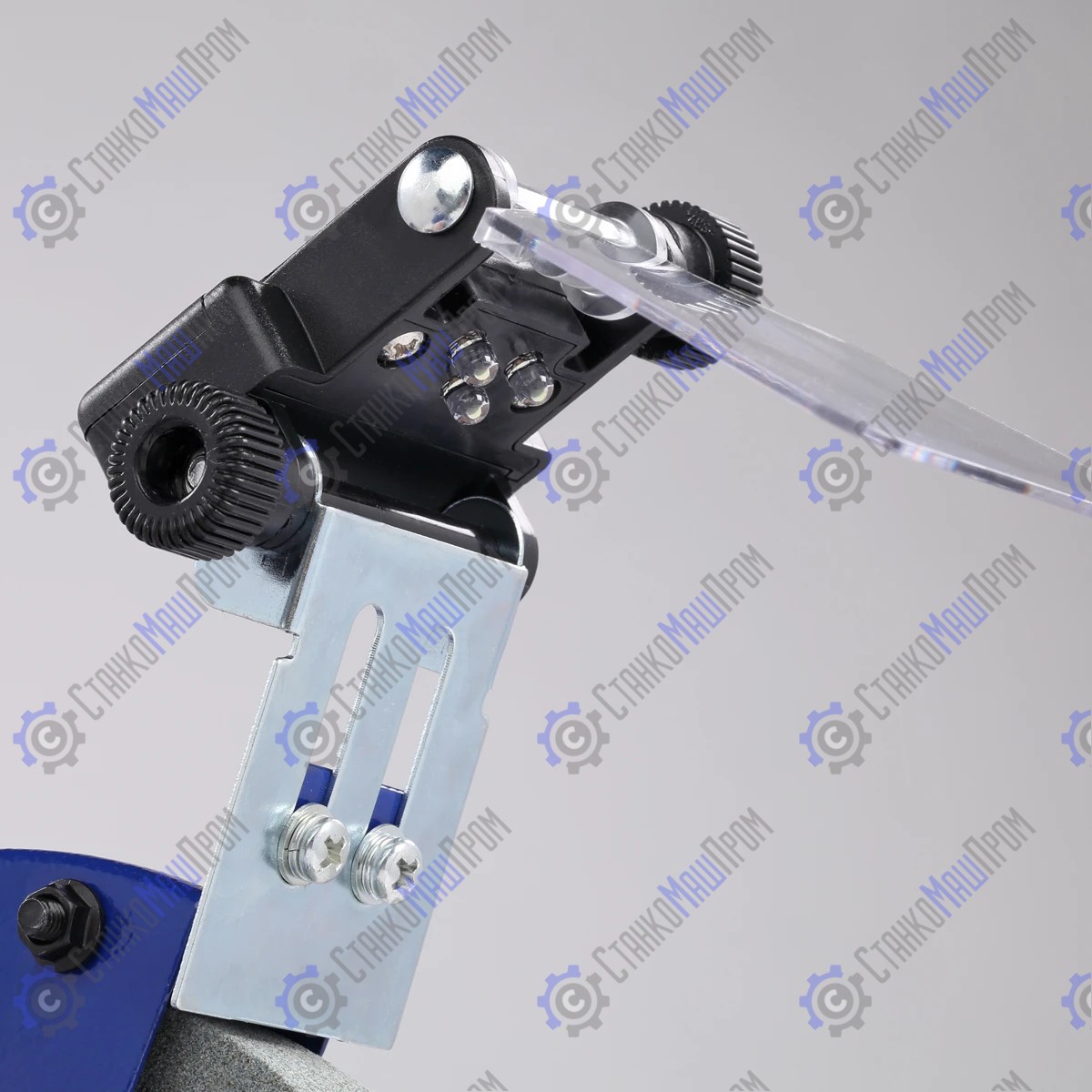 Оба диска оснащены подсветкой, стальными рабочими упорами (подручниками), защитными кожухами (листовая сталь), искрозащитными экранами (поликарбонат). Основание станка стальное. На переднюю часть станины выведен выключатель. Имеются четыре отверстия для крепления к верстаку.