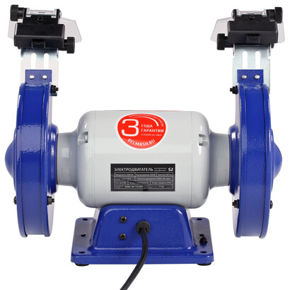 Это модель среднего размера с традиционной компоновкой. По центру расположен мощный асинхронный двигатель - 500 Вт. По обе стороны от двигателя установлены заточные диски диаметром 150 мм и шириной 20 мм с различной зернистостью. Диски изготовлены из нормального электрокорунда (15А). Такой абразив используют для снятия заусенцев, фасок, обдирки на небольших заготовках, восстановления эксплуатационных свойств ручного инструмента, такого как ножи, топоры, секаторы и т. п