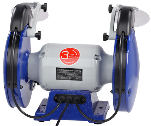 По центру расположен мощный асинхронный двигатель (600 Вт). По обе стороны от двигателя установлены заточные диски диаметром 200 мм и шириной 25 мм с различной зернистостью. Диски изготовлены из нормального электрокорунда (15А). Такой абразив используют для снятия заусенцев, фасок, обдирки на небольших заготовках, восстановления эксплуатационных свойств ручного инструмента, такого как ножи, топоры, секаторы и т. п. Оба диска оснащены рабочими упорами (литой алюминий), защитными кожухами, узлами подсветки, искрозащитными экранами (один из них с линзой).