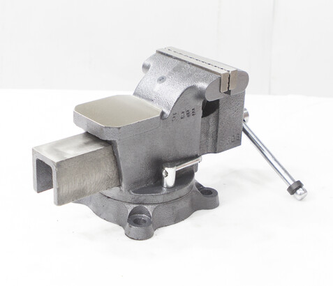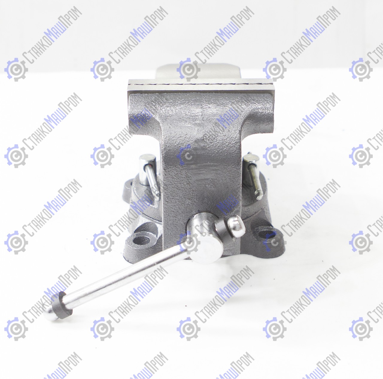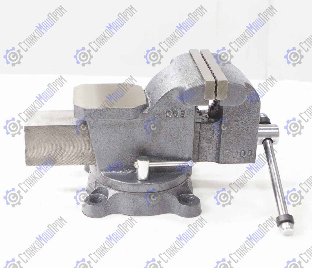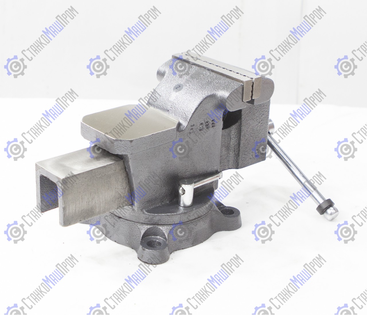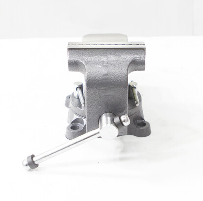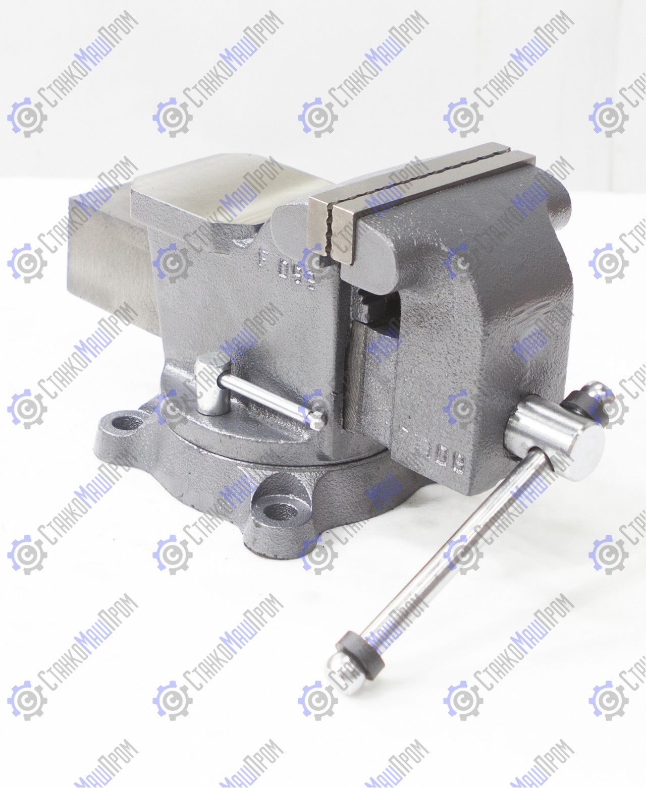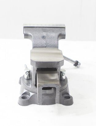 Закрытый ходовой винт тисков защищен от попадания металлической стружки и опилок. Тиски имеют возможность поворота на 360° относительно своего основания. Зев тисков предназначен для крепления трубы в тисках.