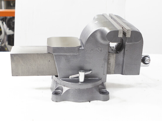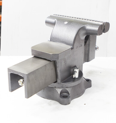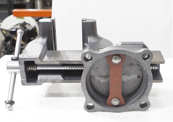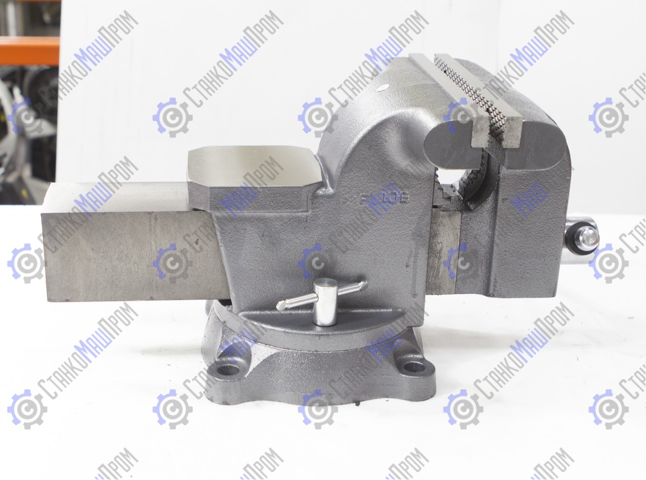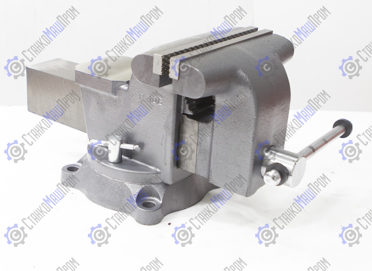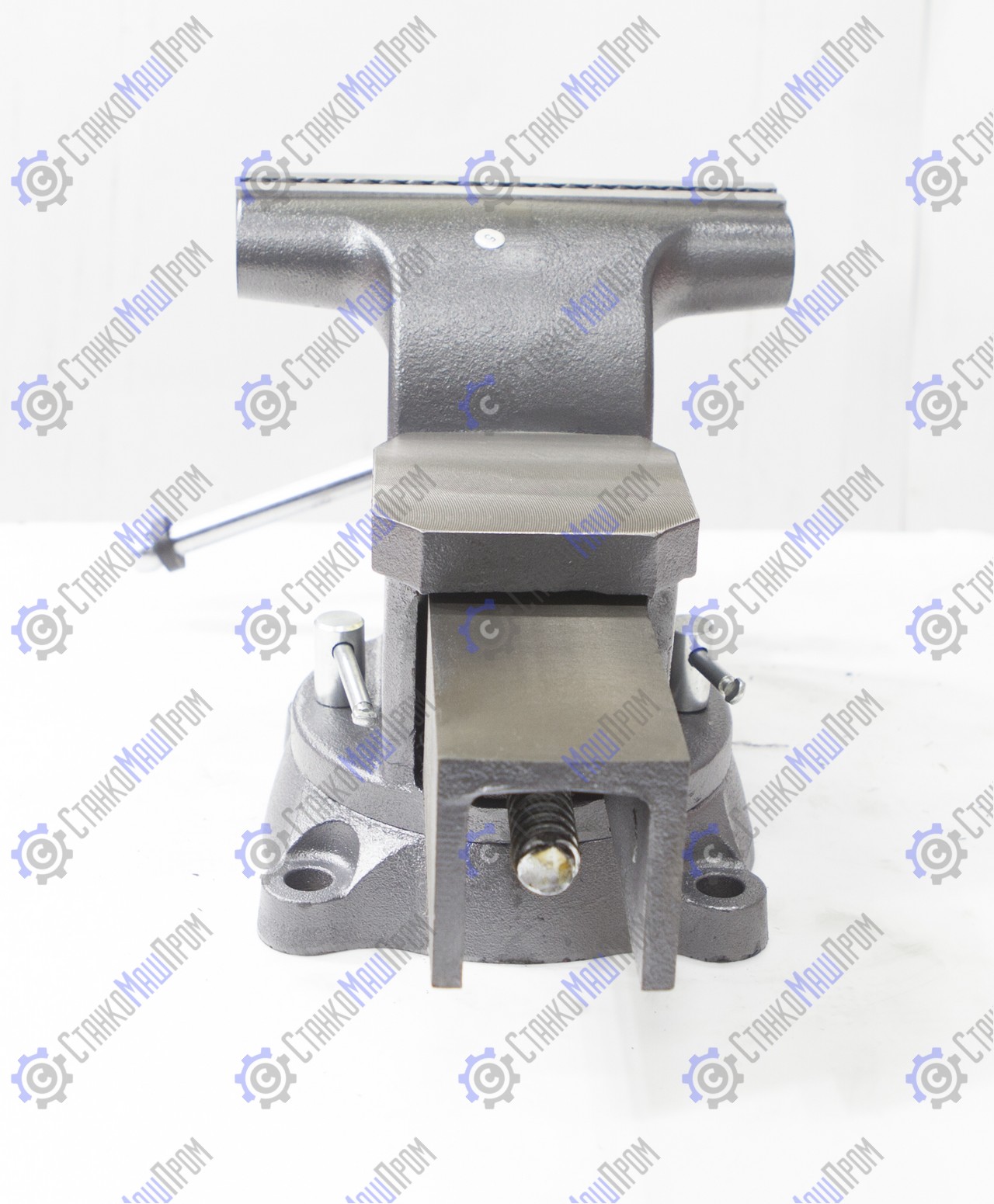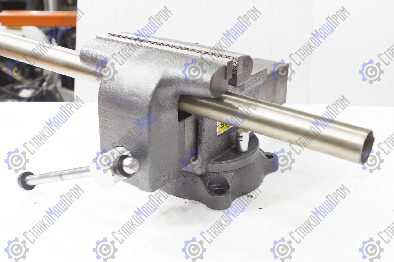 Закрытый ходовой винт тисков защищен от попадания металлической стружки и опилок. Тиски имеют возможность поворота на 360° относительно своего основания. Зев тисков предназначен для крепления трубы в тисках.