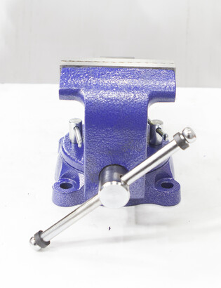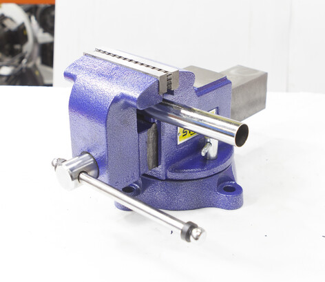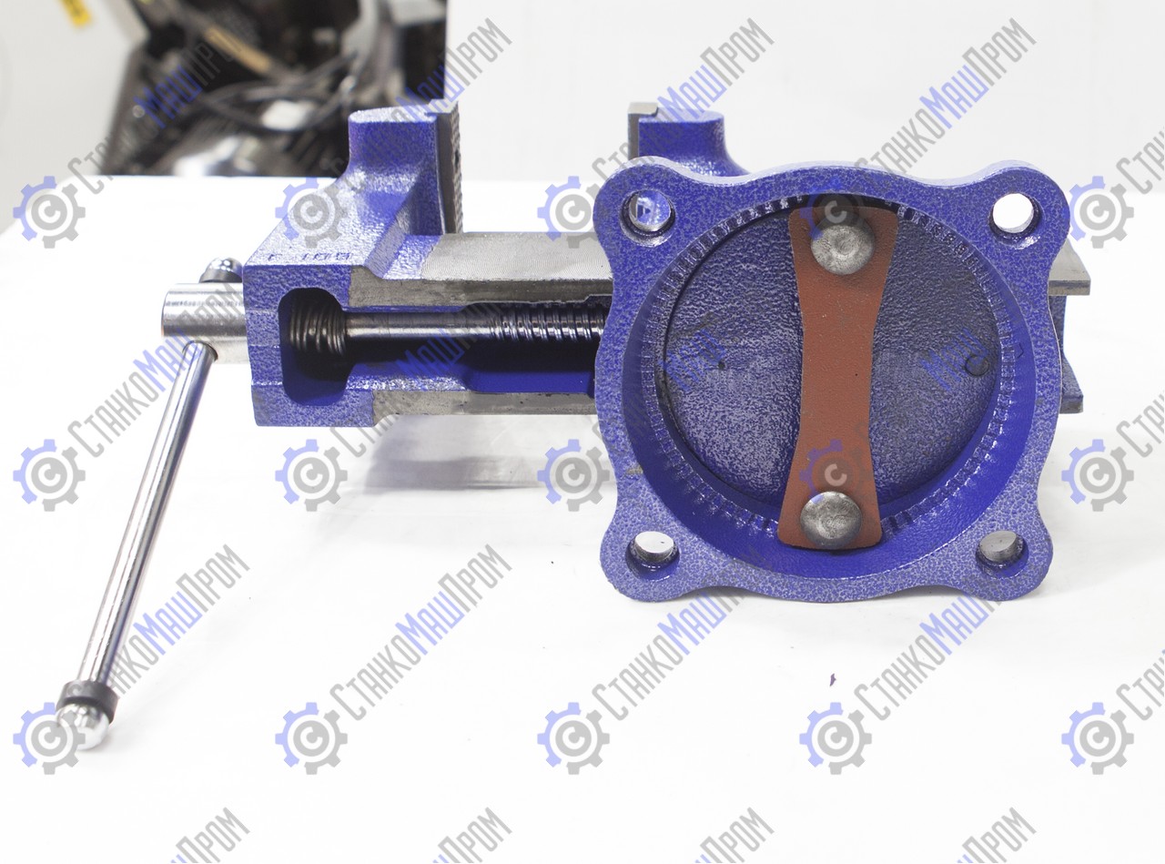 Закрытый ходовой винт тисков защищен от попадания металлической стружки и опилок. Тиски имеют возможность поворота на 360° относительно своего основания. Зев тисков предназначен для крепления трубы в тисках.