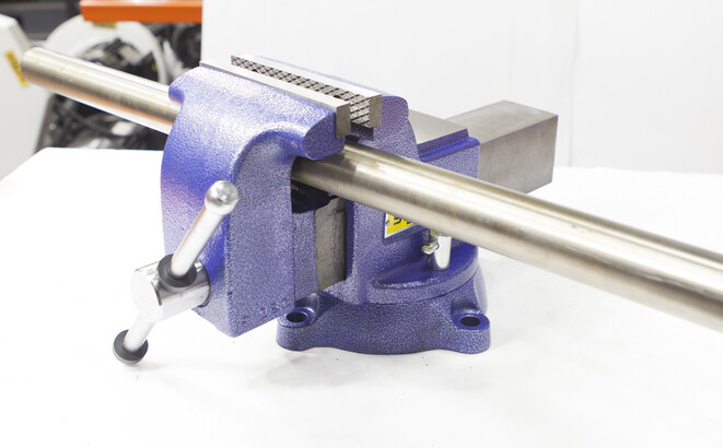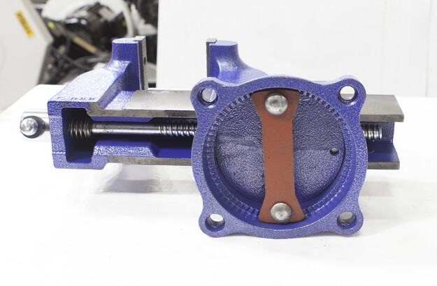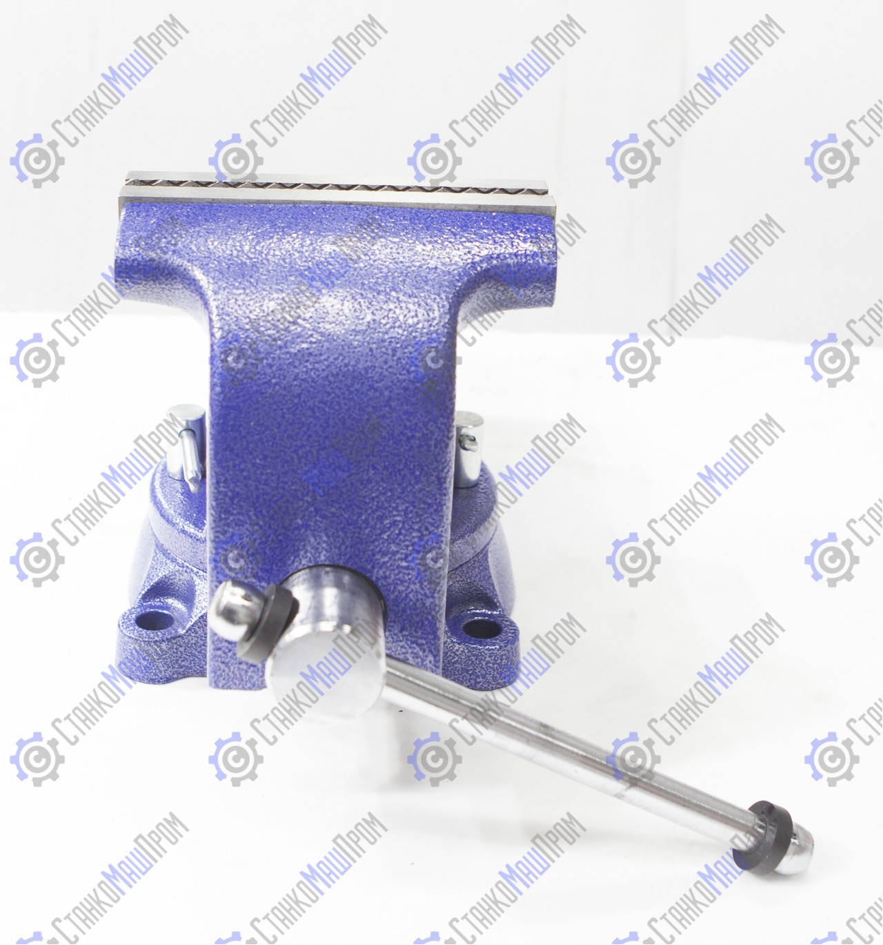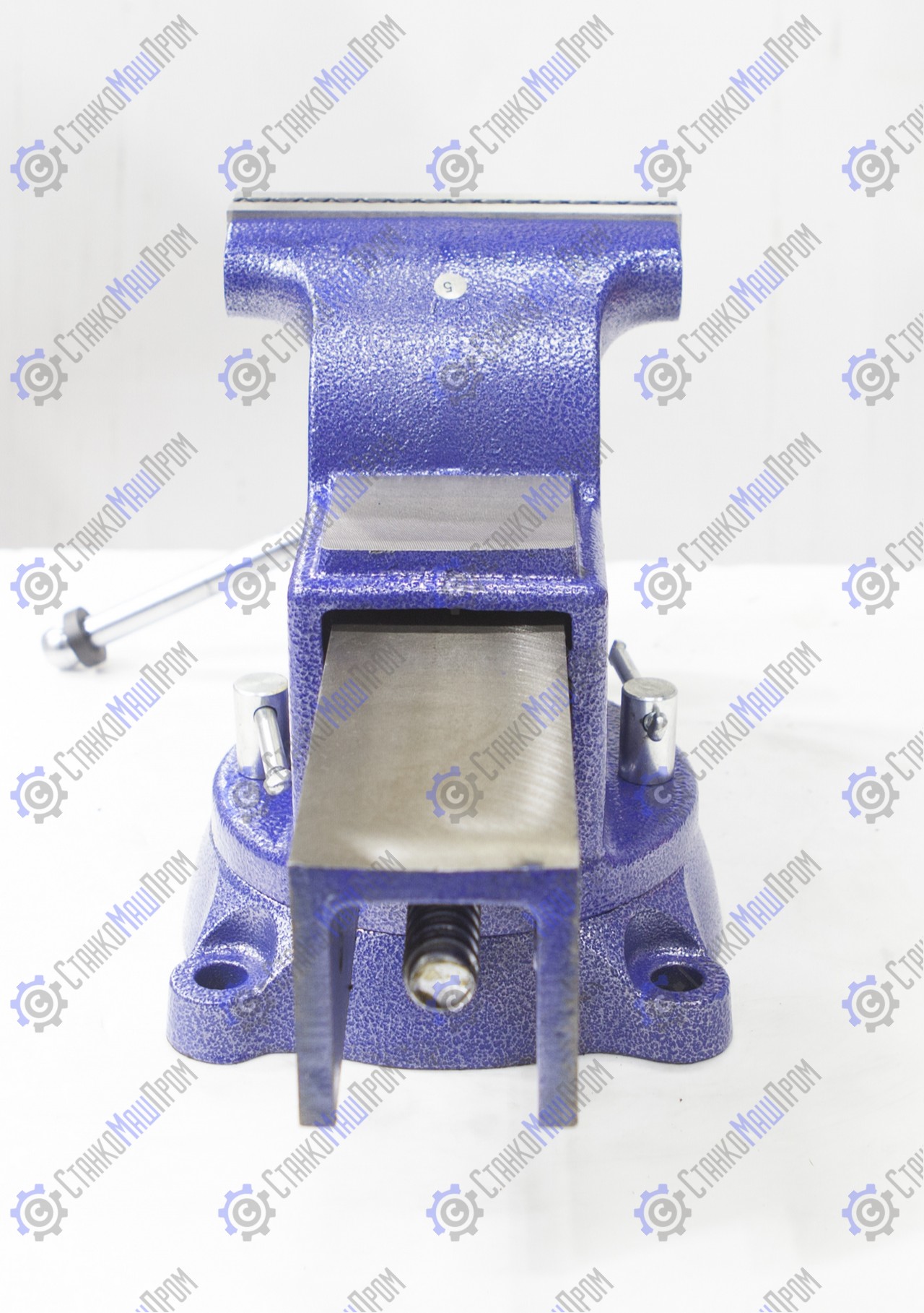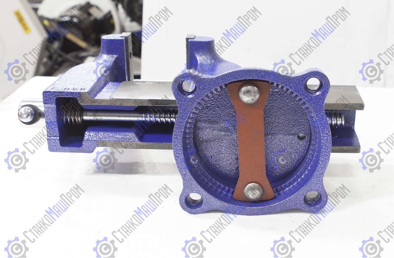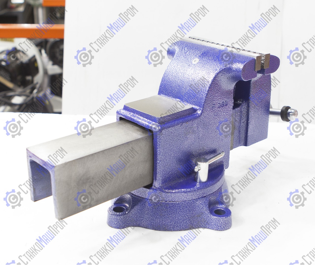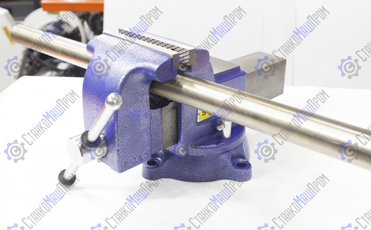 Закрытый ходовой винт тисков защищен от попадания металлической стружки и опилок. Тиски имеют возможность поворота на 360° относительно своего основания. Зев тисков предназначен для крепления трубы в тисках.