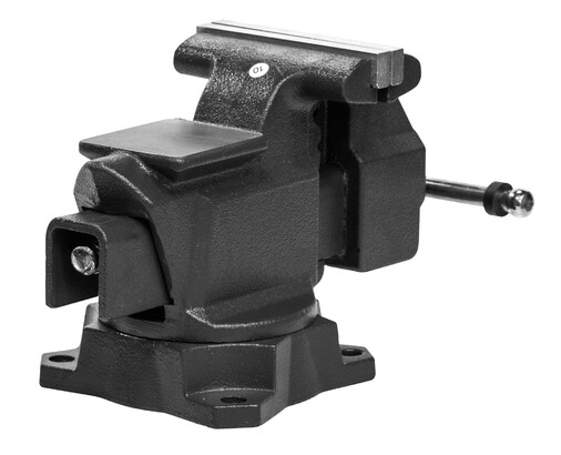 Закрытый ходовой винт тисков защищен высококачественной стальной пластиной от попадания металлической стружки и опилок. Тиски имеют возможность поворота на 210° относительно своего основания. Винт ручки и ручка – хромированные с резиновыми ограничителями.Зев тисков предназначен для крепления трубы в тисках.