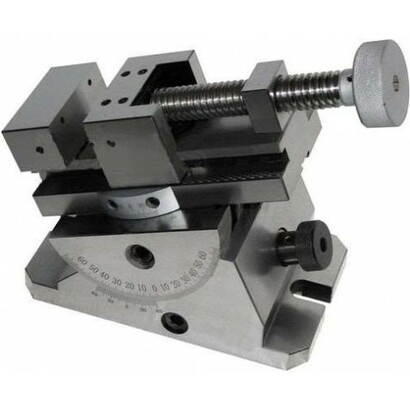 Корпус этих тисков может поворачиваться на 360° по плоскости вокруг оси и наклоняться на 45° с помощью поворотного устройства. Могут использоваться на шлифовальных и фрезерных станках, для машинной обработки скошенных под углом поверхностей и отверстий.