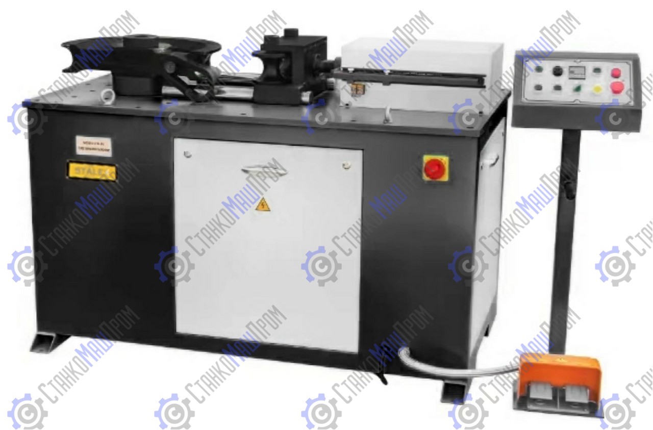 Применяется для гибки на угол до 180°, макс. размер трубы Ø80мм мин. Размер трубы Ø40, с толщиной стенки до 9мм (сталь). Мин. Диаметр прутка 32,2 мм, максимальный 50,8 мм, для квадратной трубы максимальный размер 80х80 мм, минимальный 40х40 мм. Гибка может производиться различной конфигурацией и в разных плоскостях, модель подходит для работы в условиях мелкосерийного и индивидуального производства. Угол гибки задаётся и контролируется путем ввода необходимого угла через счетчик-индикатор, диапазон угла гибки от 0 до 180°.
