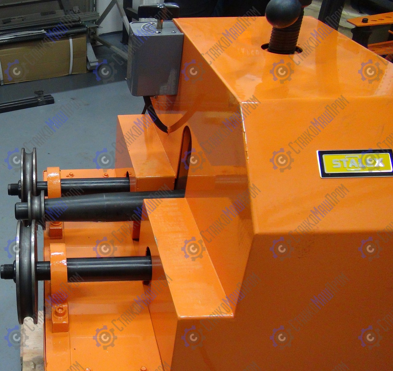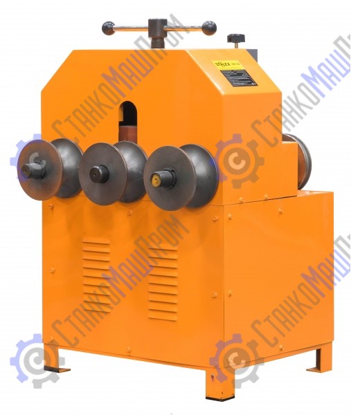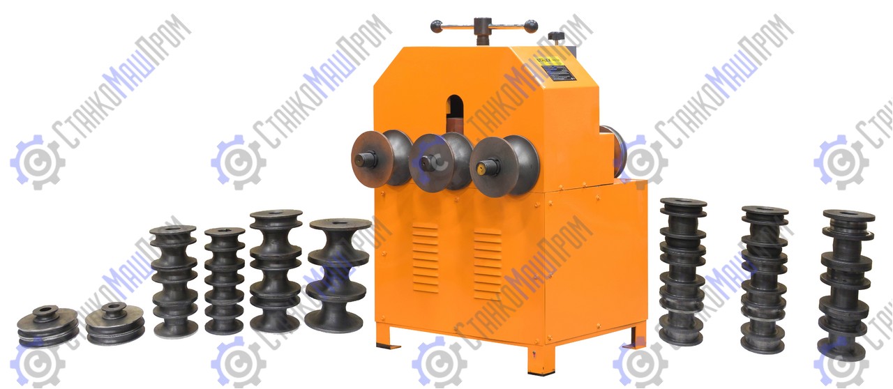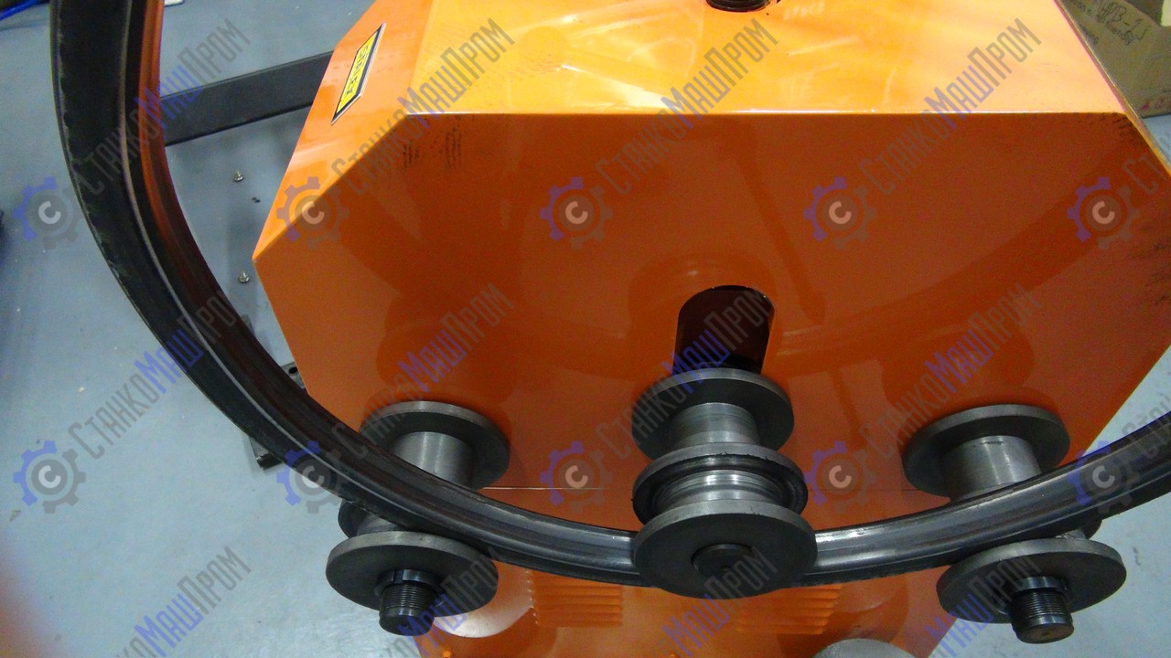 Тип станка – электромеханический, основное движение передаётся от электродвигателя расположенного в корпусе станка, через блок цепных передач, на два нижних приводных вала со сменными роликами. Что позволяет прокатывать/перемещать заготовку в обоих направлениях - благодаря такой конструкции многократно повышается производительность работы, а также даёт возможность монтажнику прикладывать меньше усилий по сравнению с ручными станками при гибки стальных труб, и затрачивать на гибку гораздо меньше времени. Второе движение – это движение механического продавливающего верхнего ролика, который постепенно деформирует заготовку в точке соприкосновения с заготовкой.