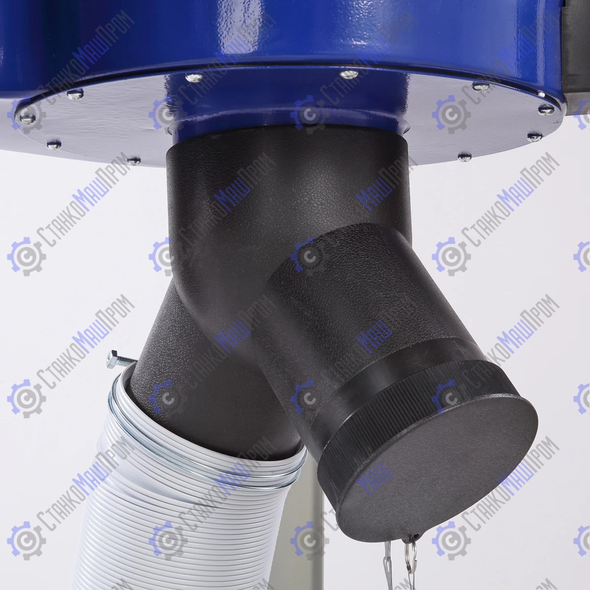 На корпусе расположен патрубок диаметром 125 мм, на него устанавливается адаптер с двумя отводами по 100 мм (идёт в комплекте). Благодаря этому к вытяжной установке BELMASH DC1600М можно подключить 2 станка для отвода стружки.