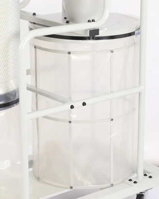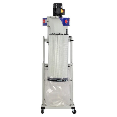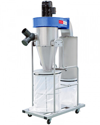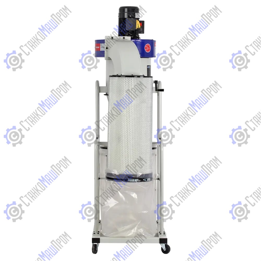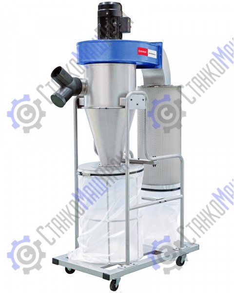 Сначала воздух с большой скоростью тангенциально подается внутрь цилиндрической части корпуса циклона. Под воздействием центробежной силы крупные частицы отбрасываются к стенкам, а затем вниз – в коническую часть аппарата. Оттуда отходы попадают в большой стружкосборник. Это первая ступень очистки. Затем воздух поступает в фильтр-картридж, где за счет прохождения потока через фильтрующий элемент с большой площадью поверхности (3,5 кв. м) происходит окончательная очистка. Мелкие частицы собираются в малом мешке, который крепиться под фильтром. Это вторая ступень очистки. Очистка фильтра проходит ручным способом, при вращении рукоятки осевшие частицы стряхиваются вниз.