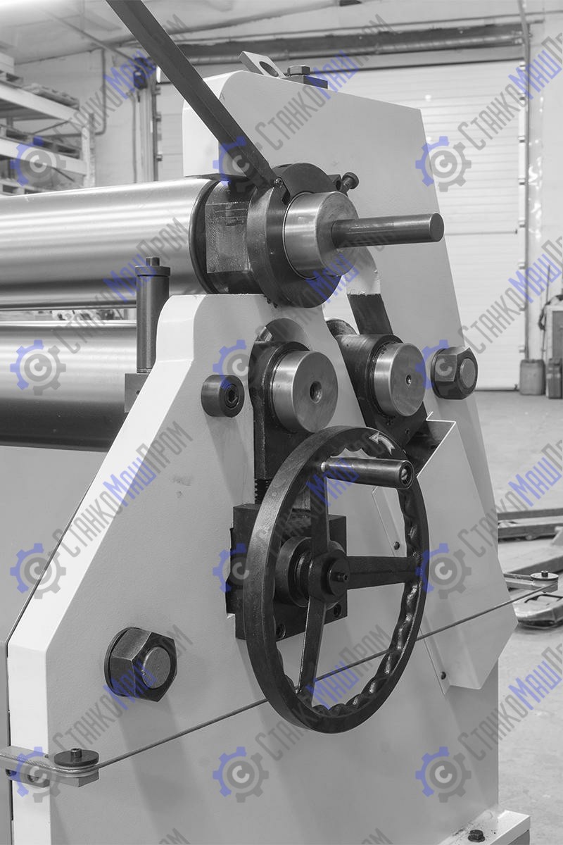 Вальцовочный станок предназначен для предания листу цилиндрической формы различного радиуса, данное оборудование широко применяется для изготовления комплектующих вентиляции, водосточного оборудования, в случаях производства цилиндрических и конических изделий, правке плоских заготовок, подгибке кромок. Выносная педаль дублируется пультом управления на станине станка. Цепная передача передаёт вращение с электродвигателя на валы. Верхний вал откидной, для легкого снятия готовых изделий. Откидной вал оснащен замком для предотвращения его самопроизвольного раскрытия в процессе работы.