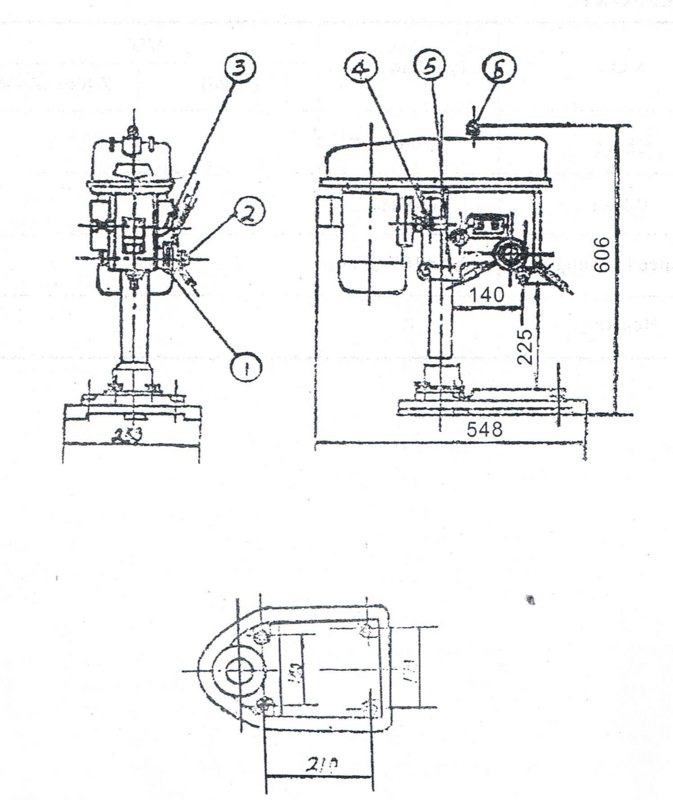 Привод дрели очень прост. Это осуществляется с помощью двигателя, который приводит в движение шкив с помощью клинового ремня (Z406B - это кольцевой ремень), и шкив, следовательно, приводит шпиндель во вращение через втулку шпинделя, изменение скорости вращения шпинделя будет осуществляться путем переключения ремня на соответствующую ступень скорости на конусном шкиве. В случае изменения частоты вращения шпинделя сначала ослабьте винт 4 (рис.1), прижмите двигатель к стойке, чтобы ослабить натяжение ремня, а затем переключите ремень на требуемую частоту вращения с помощью конусного шкива. После этого выньте двигатель, чтобы обеспечить надлежащее натяжение ремня, и снова затяните винт 4.